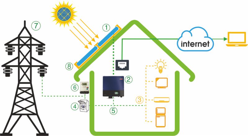 Đây là giải pháp sử dụng nguồn điện được tạo ra từ hệ thống năng lượng mặt trời (NLMT) nối trực tiếp vào hệ thống điện lưới hiện có gọi là hệ thống điện năng lượng mặt trời hòa lưới.