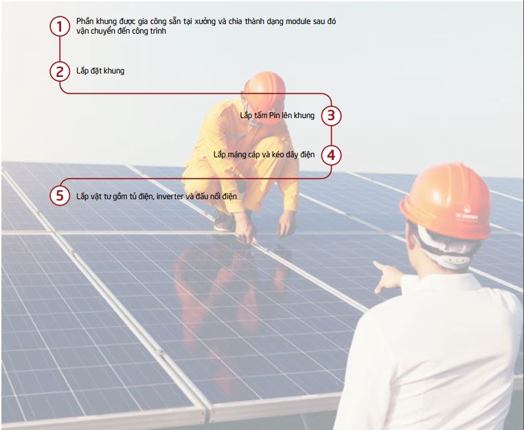 Sau khi nhận bàn giao mặt bằng, thiết bị chính (pin, inverter), phần khung, vật tư điện, vật tư phụ khác,… được vận chuyển đến công trình và triển khai lắp đặt theo phương pháp thi công đã được phê duyệt, đảm bảo các yếu tố: kỹ thuật, thẩm mỹ, an toàn lao động.